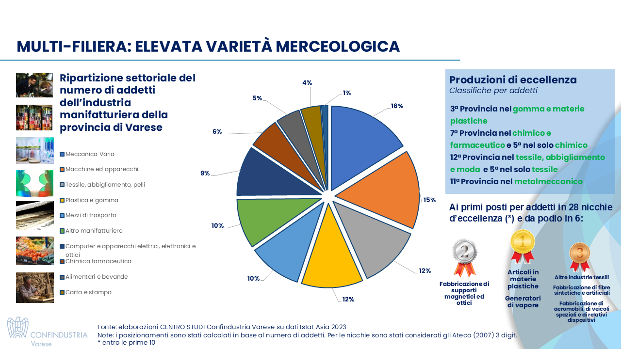 I settori più rappresentativi sono quelli metalmeccanico, con specializzazioni significative nel campo dell’aeronautica, delle macchine utensili, delle forgiature e fonderie, degli elettrodomestici, della lavorazione di metalli, delle apparecchiature elettriche e antifurti, oltre a lavorazioni nei diversi comparti della filiera dell’impiantistica e dell’energia, tessile-abbigliamento, con specializzazioni nella filatura, tessitura tintoria e finissaggio; maglieria e calzetteria; ricami; abbigliamento e accessori, il chimico e farmaceutico, il materie plastiche e gomma (con anche ad esempio specializzazioni nella filiera dell’occhialeria). Ma sul territorio sono presenti specializzazioni anche in altri settori tra cui alimentare, con una presenza di produttori nel campo della lavorazione del latte (burro, latticini), del cioccolato e della birra - carta, stampa ed editoria - con numerose realtà legate all’editoria e alla produzione di imballaggi e legno con imprese legate all’arredamento e, particolarità dell’area, importanti produttori di pipe a livello nazionale. Questa varierà merceologica è associata spesso al concetto di eccellenza: la provincia di Varese è ai primi posti in Italia per numero di addetti in numerose nicchie produttive e si guadagna il podio in alcune di esse.